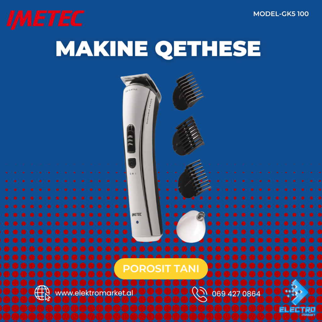 Makine Qethese Imetec 📌 Detajet Me 5 funksione ne nje pajisje te vetme Pastrohet lehtesisht Me 12 prerje te ndryshme per gjatesi te ndryshme te qimes nga 0.5 - 8 mm Kjo makine ka edhe funksion 3 ne 1 me koka te ndryshme Perbere nga material inoks qe nuk ndryshket Koka dhe tehu pastrohen lehtesisht Karikohet ne energji elektrike 100-240 V, me frekuence 50/60 Hz Mund te punoje deri ne 60 min dhe i duhet nje karikim i plote per rreth 10 ore Pastrohet lehtesisht dhe kokat mund te lahen me uje 📍Ndodhemi ne tregun Çam, Tirane 🚚 Mundesojme dergesa ne te gjithe Shqiperine Per cdo informacion ose porosi online na kontaktoni ne 📥/📞 Whatsapp ose tel 0694270864
