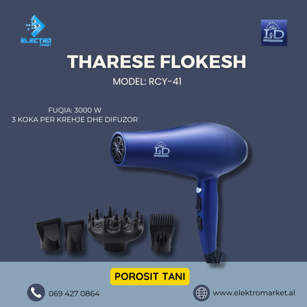 Tharese Flokesh LD 📌 Detajet: Tharese Flokesh me fuqi 3000W. 2 nivele nxehtesie. Shoqerohet me koke difuzori dhe 3 koka per krehje. 📍Ndodhemi ne tregun Çam, Tirane 🚚 Mundesojme dergesa ne te gjithe Shqiperine Per cdo informacion ose porosi online na kontaktoni ne 📥/📞 Whatsapp ose tel 0694270864