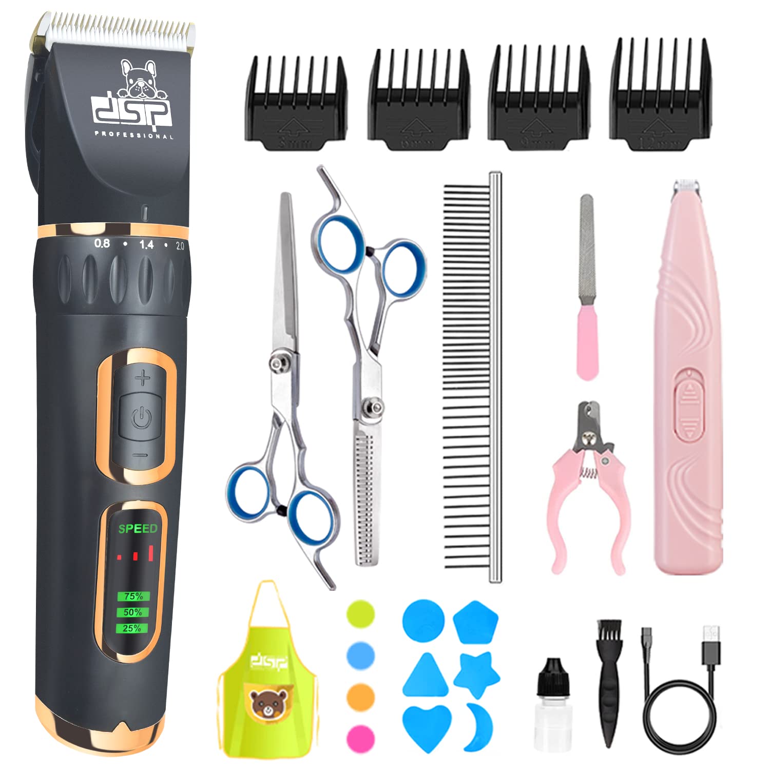 4 krehër udhëzues (3mm, 6mm, 9mm, 12mm), krehër çeliku, pincë, piskatore, furçë pastrimi, shishe vaji, kabllo USB karikimi
