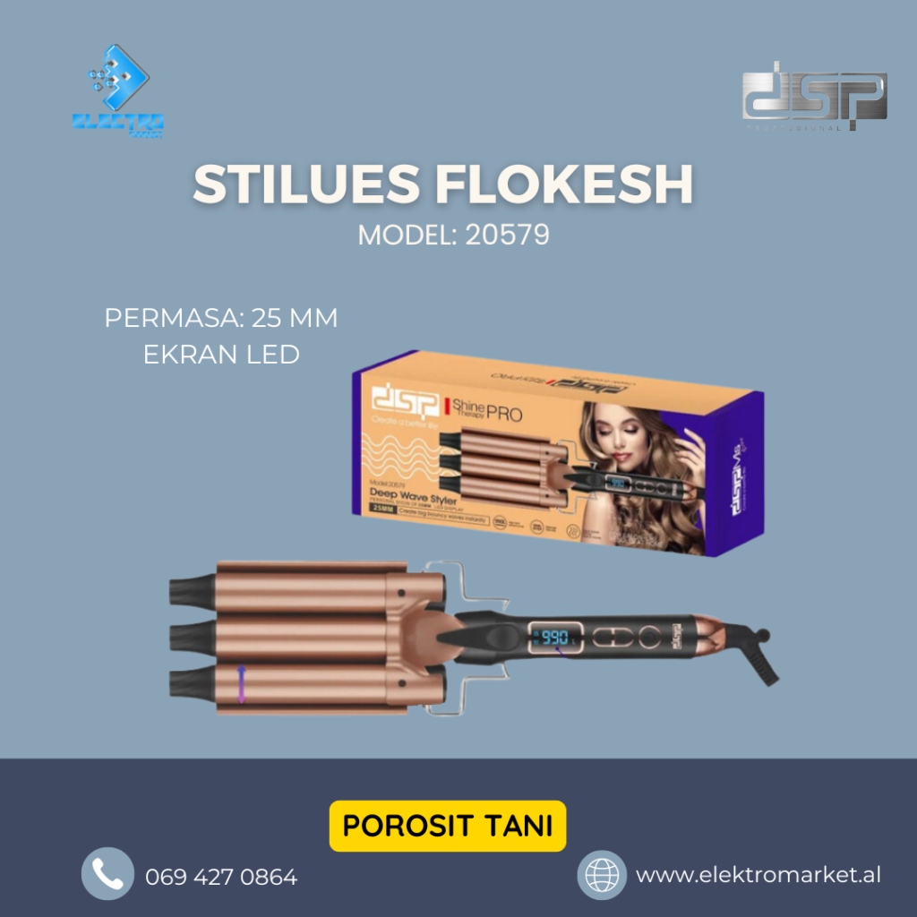 Stilues Flokesh DSP 📌 Detajet: Mashe per kacurrelat perfekte, te buta dhe plot shkelqim Veshje qeramike per te mbrojtur flokun nga nxehtesia gjate perdorimit Me ekran Led i cili tregon temperaturen e mashes dhe me butona per ndezje/fikje/rritje/ulje te temperatures. Diameter 16 mm Tensioni: 110-240 V- 50/60 Hz Fuqia: 40 W Kordon rrotullues 📍Ndodhemi ne tregun Çam, Tirane 🚚 Mundesojme dergesa ne te gjithe Shqiperine Per cdo informacion ose porosi online na kontaktoni ne 📥/📞 Whatsapp ose tel 0694270864